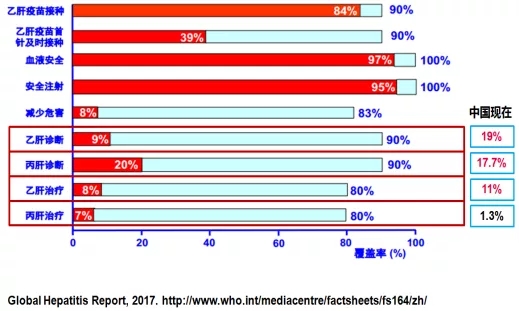 目前我国乙肝、丙肝的诊断率分别为19%、17.7%,治疗率分别为11%、1.3%,和世界平均水平相差较大,实现世界卫生组织(WHO)提出的2030消除肝炎危害目标(2030年乙肝、丙肝诊断率要达到90%,治疗率要达到80%)任务较为艰巨。